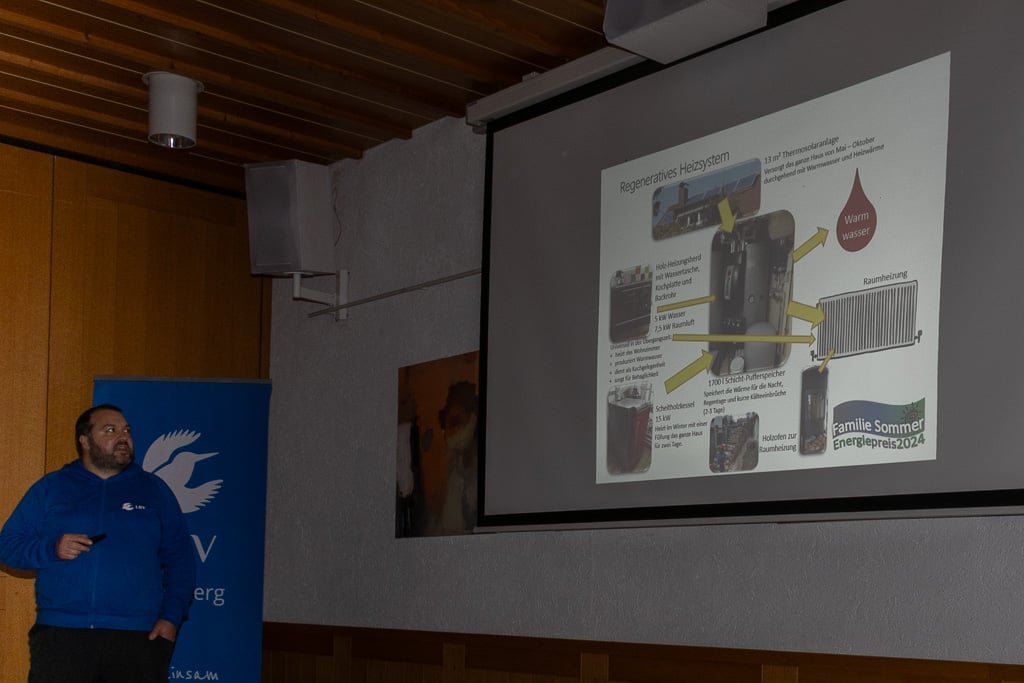 Nach einer kurzen Pause, bei der es Naturbilder auf der Leinwand zu sehen gab, stand der zweite Vortrag des Abends auf dem Programm. Der Landkreis Ebersberg zeichnet erfolgreich umgesetzte Projekte zum Klimaschutz mit dem Energie-& Nachhaltigkeitspreis aus. 2024 hat Bene Sommer bei dem Wettbewerb einen Preis gewonnen. Mit welchen Maßnahmen er die Jury überzeugte, wurde in seinem Bericht deutlich. Durch energiesparende Sanierungen im Eigenheim, dem Einsatz von erneuerbarer Energie für Heizung, Warmwasser und PV-Anlage auf dem Hausdach, konnte der CO² Ausstoß deutlich reduziert werden. Darüber hinaus hat die Familie Sommer auch den persönlichen Lebensstil „klimagerecht“ angepaßt, z.B. durch Einkauf regionaler Lebensmittel, Urlaub in der Region anstatt Fernreisen, Elektroauto anstatt „Verbrenner“.